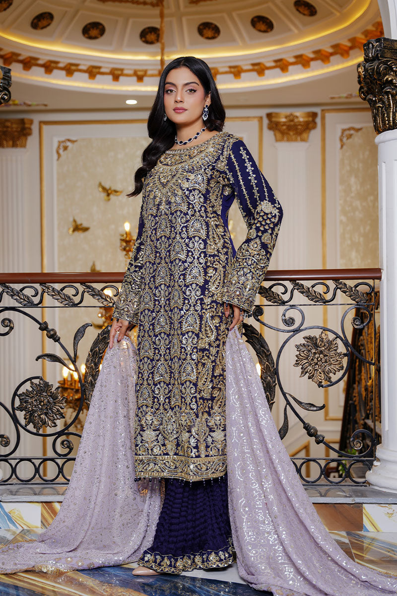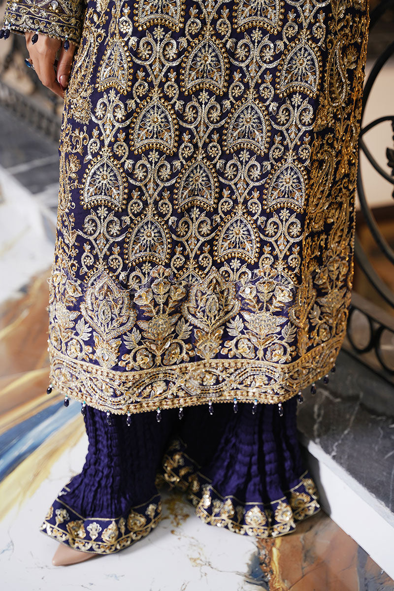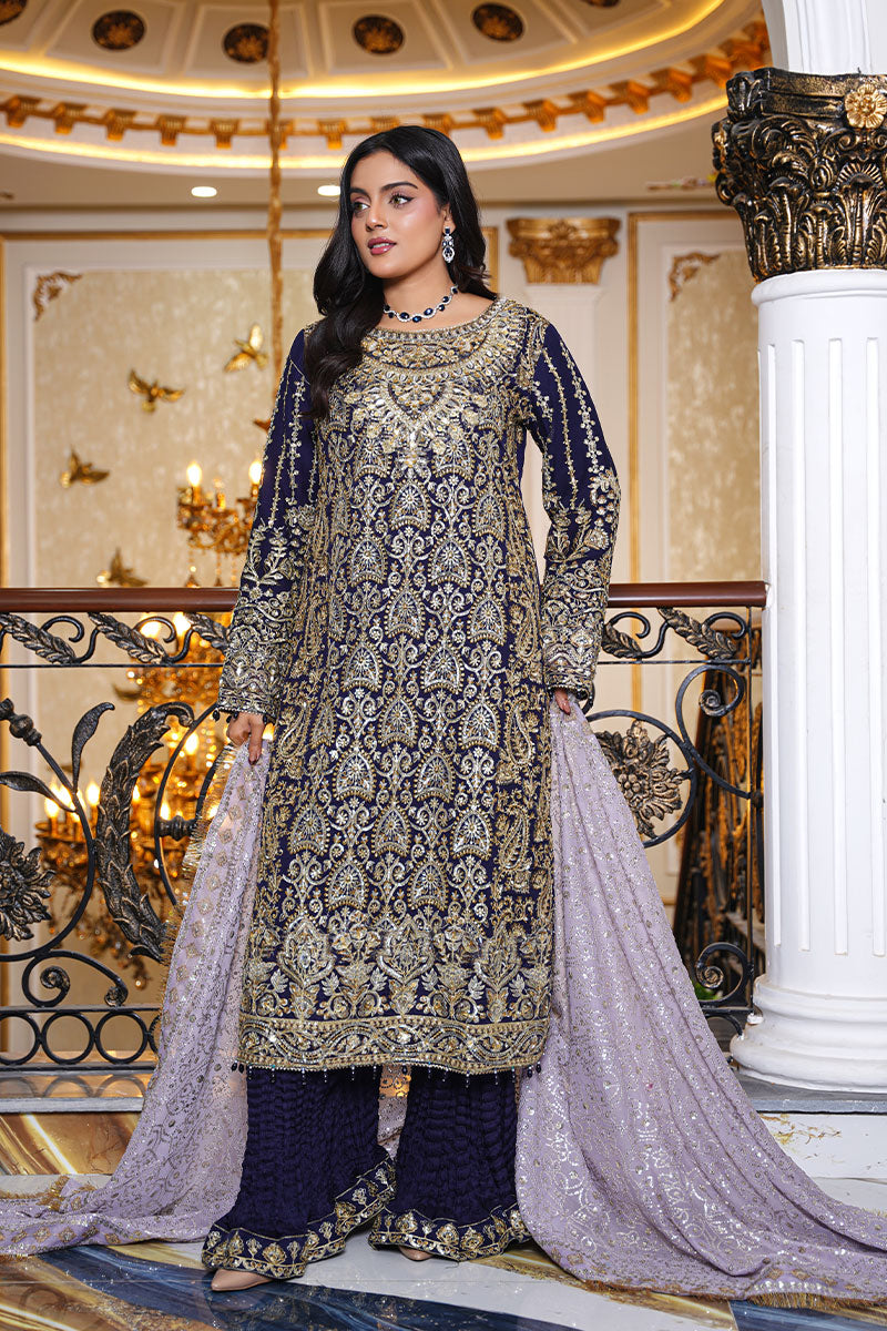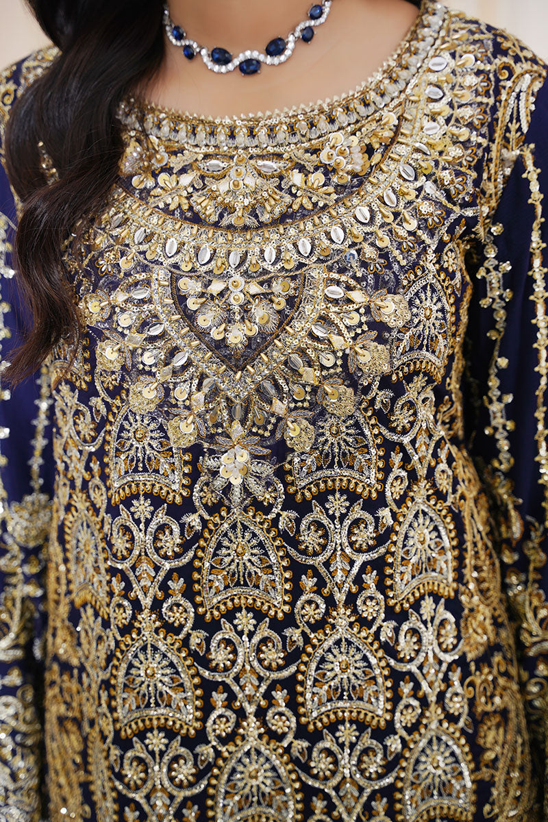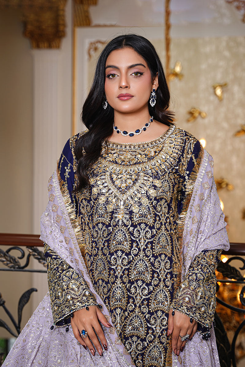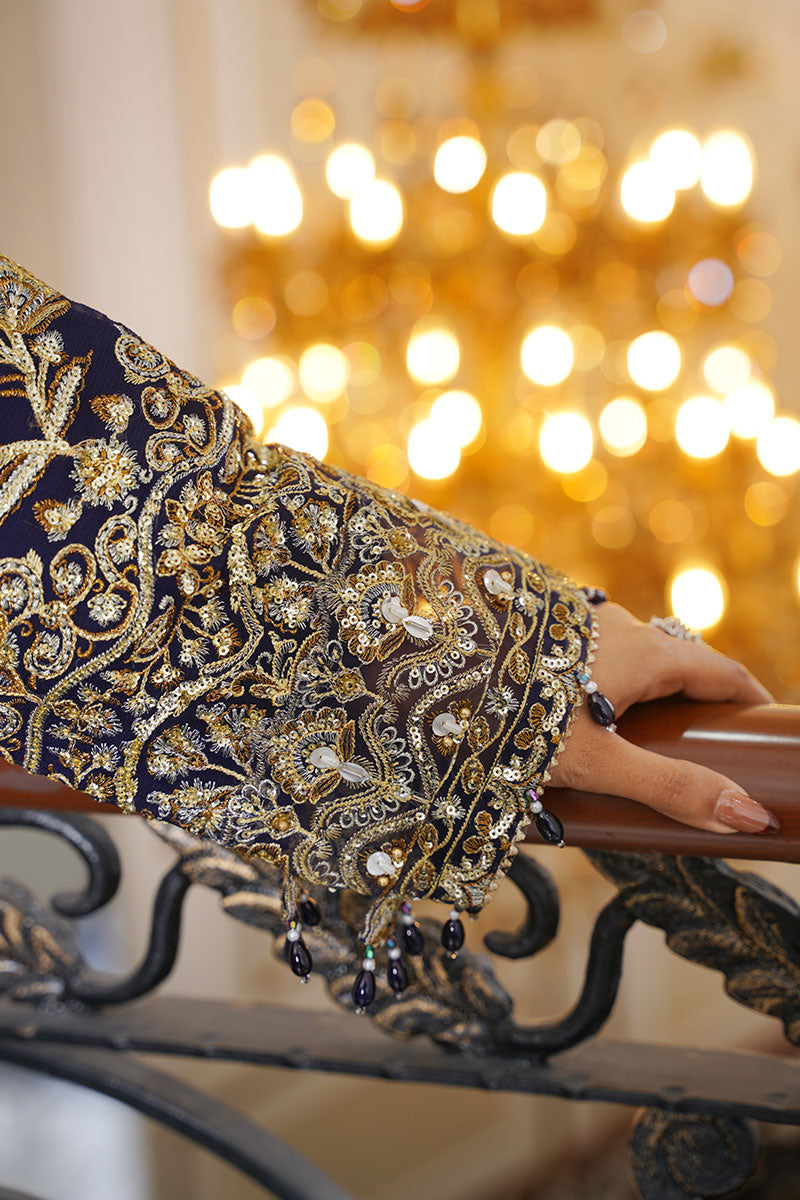 A regal navy blue ensemble richly adorned with intricate gold embroidery. Paired with textured trousers and a softly shimmering dupatta, this outfit embodies timeless elegance, perfect for weddings, formal evenings, and grand festive occasions.