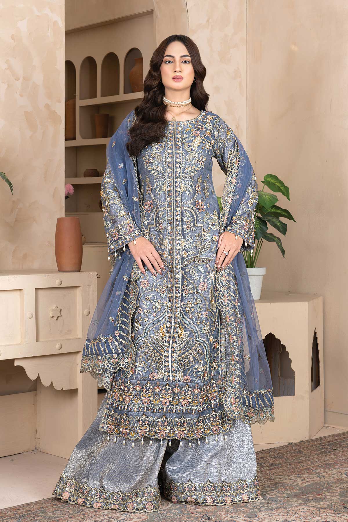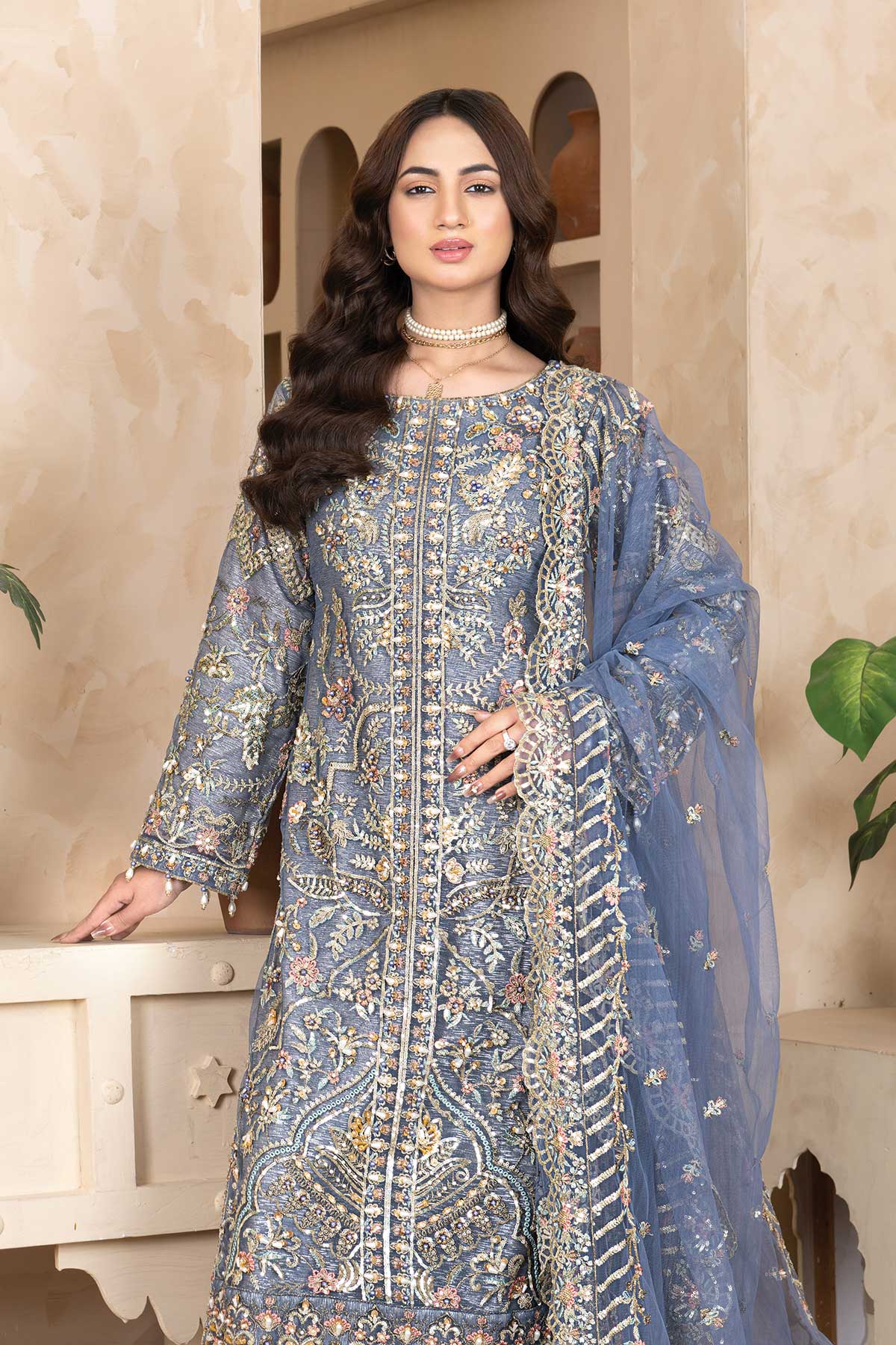 An elegant formal ensemble crafted in a soft blush-pink hue, this outfit showcases intricate embroidery with delicate floral and pearl-inspired embellishments. The shirt is adorned with fine threadwork, sequins, and bead detailing, creating a refined, luxurious aesthetic. Paired with a gracefully embroidered chiffon dupatta featuring scalloped borders, the look is completed with straight-cut trousers for a balanced silhouette. Ideal for festive occasions, formal gatherings, and intimate celebrations, this design blends timeless sophistication with contemporary grace.